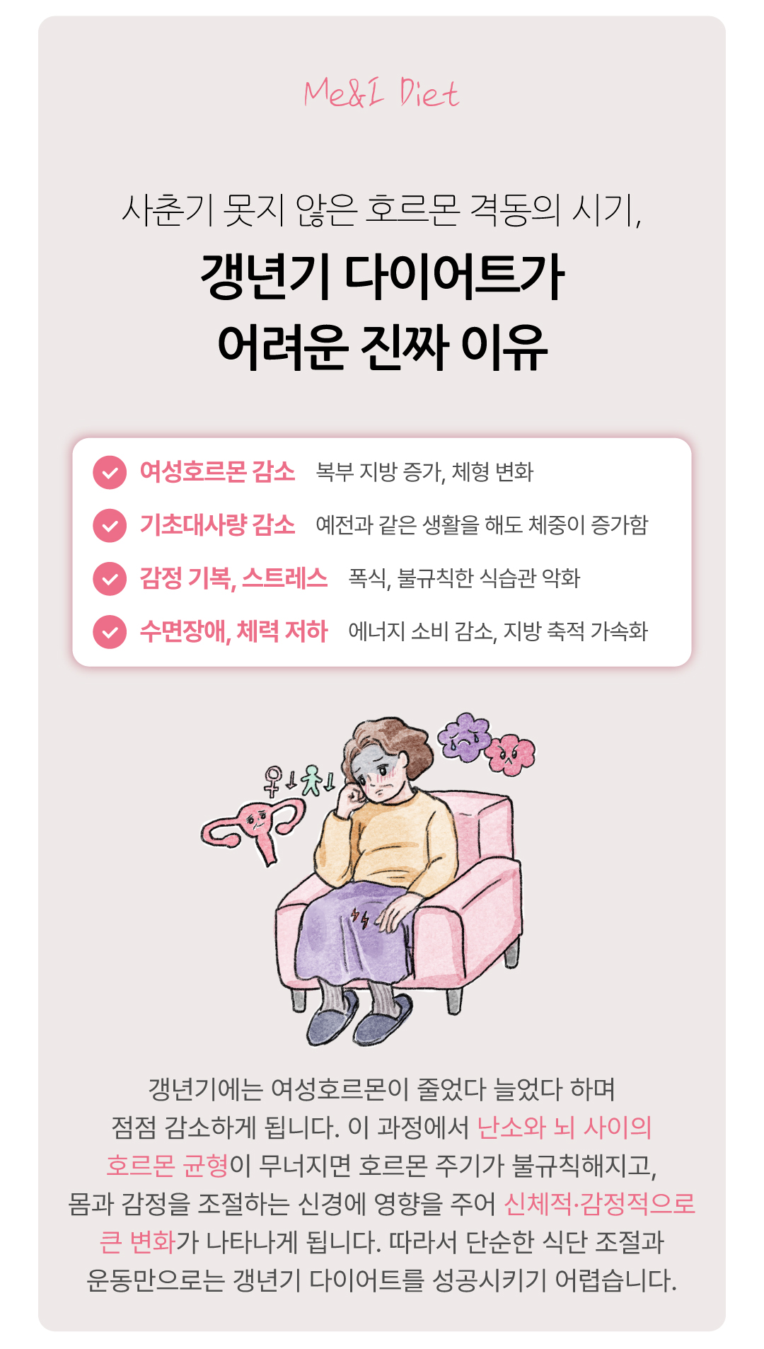 따라서 단순한 식단 조절과 운동만으로는 갱년기 다이어트를 성공시키기 어렵습니다.
