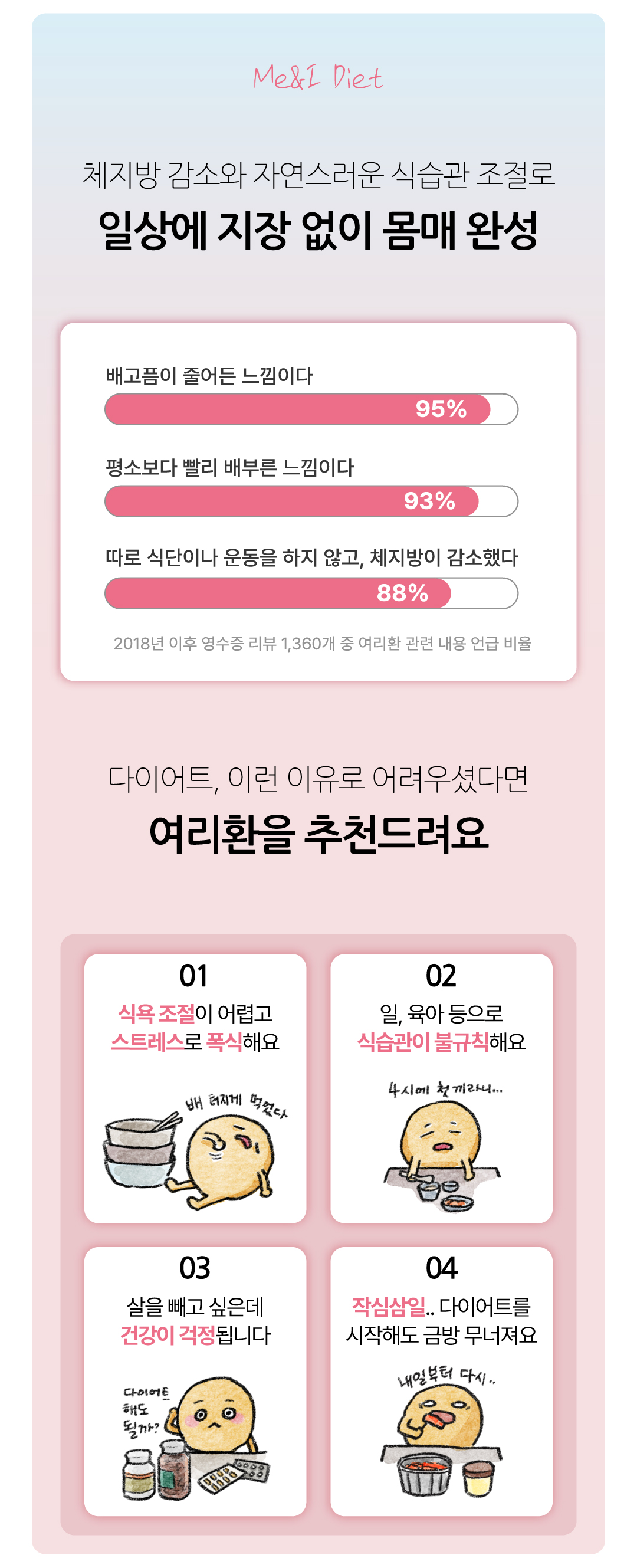 여리환을 처음 복용하였을 때는 평소 늘 배고팠던 시간이 배가 고프지가 않아서 신기했어요! 식욕이 확실히 줄어드니까 ...