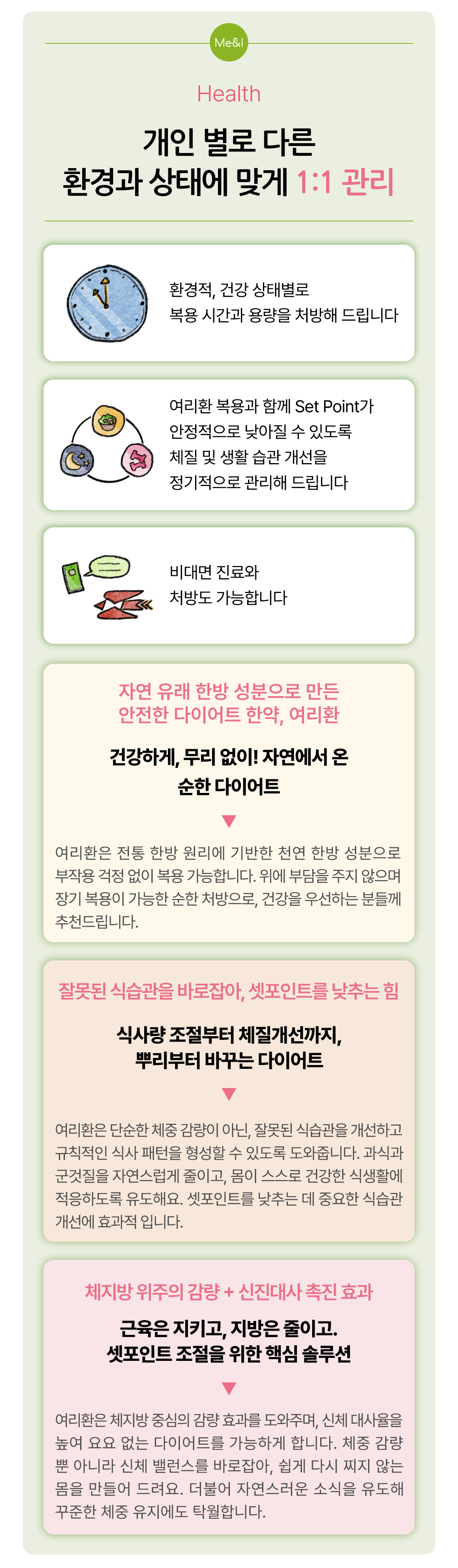 ![]() | 여리환 복용과 함께 Set Point가 안정적으로 낮아질 수 있도록 체질 및 생활 습관 개선을 정기적으로 관리해 드립니다 |