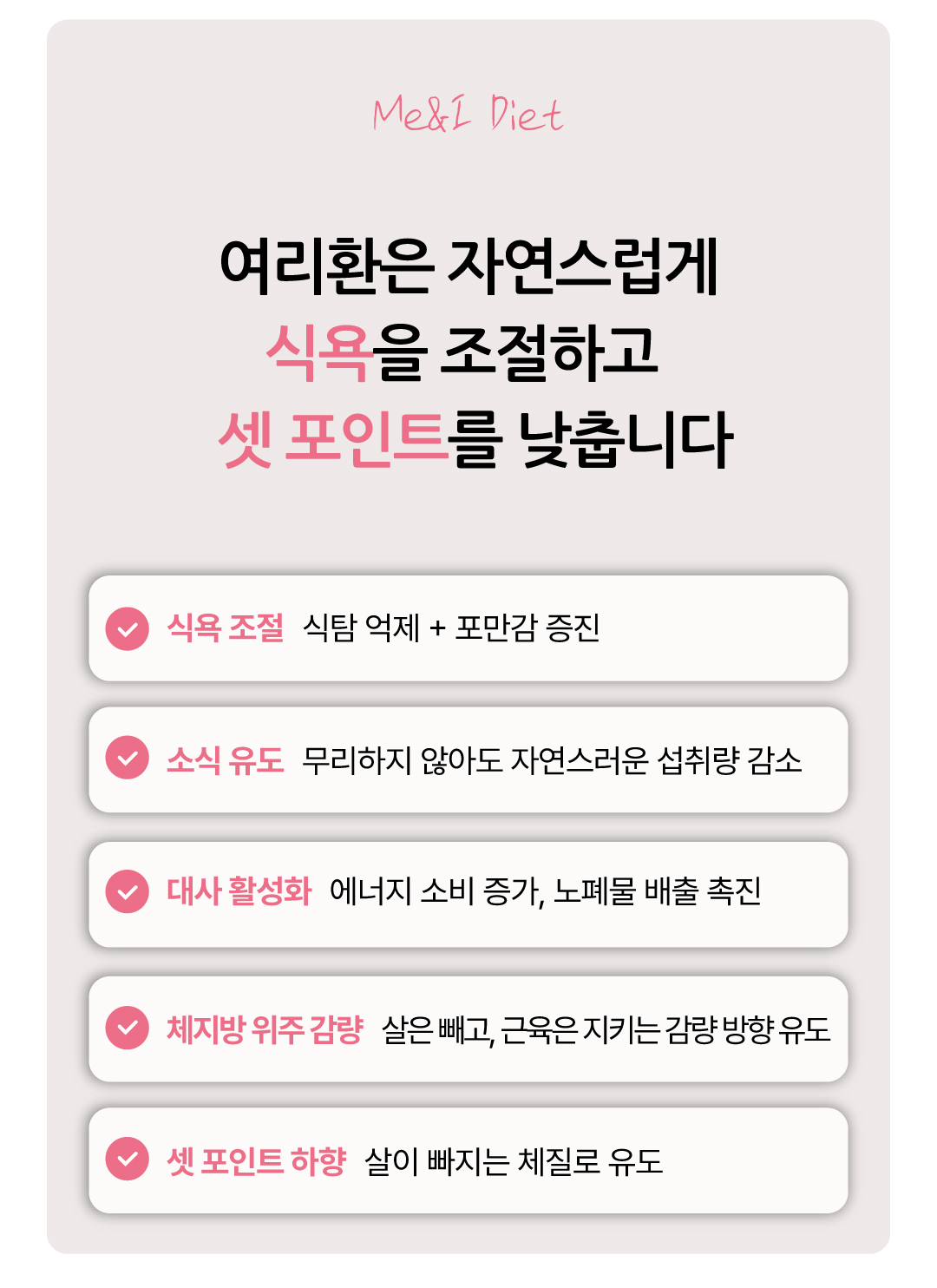 | 체지방 위주의 감량 + 신진대사 촉진 효과 : 근육은 지키고, 지방은 줄이고. 셋 포인트 조절을 위한 핵심 솔루션 여리환은 체지방 중심의 감량 효과를 도와주며, 신체 대사율을 높여 요요 없는 다이어트를 가능하게 합니다. 체중 감량뿐 아니라 신체 밸런스를 바로잡아, 쉽게 다시 찌지 않는 몸을 만들어 드려요. 더불어 자연스러운 소식을 유도해 꾸준한 체중 유지에도 탁월합니다. |
